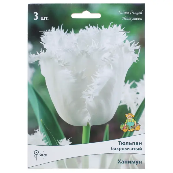 **Тюльпан бахромчатый «Ханимун»** - многолетнее травянистое луковичное растение семейства лилейных. Пользуется широкой популярностью и распространено во всех странах с умеренным климатом. Тюльпаны являются наиболее красивоцветущими среди весенних цветов и к тому же относительно неприхотливы в культуре. Отличительная особенность Бахромчатых тюльпанов - игольчатая бахрома по краям лепестков, напоминающая иней. Высота тюльпанов может варьироваться от 50 до 80 см. Окраска цветков встречается самая разнообразная: от белой до фиолетовой, кроме черной. В зависимости от того, какие классы тюльпанов использовались при выведении того или иного сорта бахромчатого тюльпана, различаются размеры цветка, сроки цветения и назначение растений. Так, сорта, полученные от скрещивания с Дарвиновыми гибридами, имеют те же сроки цветения и часто используются для выгонки. А Бахромчатые тюльпаны, полученные от скрещивания поздних тюльпанов, дают прекрасную срезку. **Местоположение:** участок должен быть рас