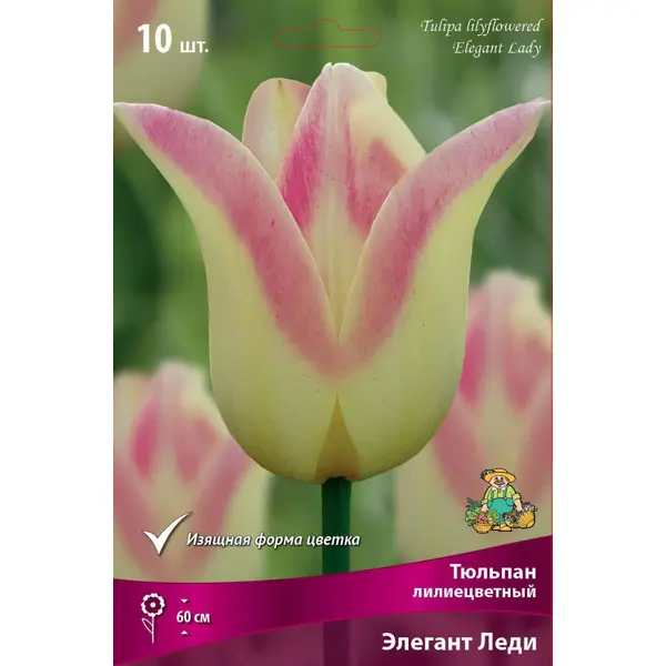 **Тюльпан лилиецветный «Элегант Леди» ** - многолетнее травянистое луковичное растение семейства лилейных. Пользуется широкой популярностью и распространено во всех странах с умеренным климатом. Тюльпаны являются наиболее красивоцветущими среди весенних цветов и к тому же относительно неприхотливы в культуре. Тюльпаны этого класса легко узнаваемы, так как своей формой напоминают цветок лилии — изящные бокалы с отгибающимися наружу и заостренными на концах лепестками. Лилиецветные тюльпаны довольно высокорослы (до 50-60 см в высоту), имеют крепкие цветоносы и цветы разнообразной окраски. Цветут во второй половине мая и, несмотря на свою немногочисленность, широко используются для озеленения садов и парков, для срезки, а некоторые сорта пригодны для выгонки. **Местоположение:** участок должен быть расположен в солнечном месте и защищен от ветра. Важно, чтобы он не имел неровностей, в которых весной и осень будет застаиваться вода - это может привести к вымоканию и загниванию луковиц. *