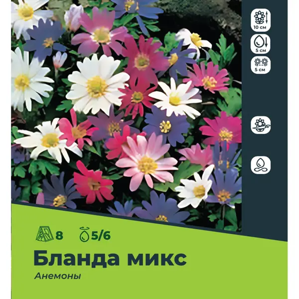 **Анемона Бланда микс** — это многолетнее травянистое растение, принадлежащее к семейству лютиковых. Оно вырастает до 30 см в высоту и имеет темно-зеленые листья. Цветки анемоны Бланда Микс могут быть белыми, розовыми или фиолетовыми, с желтой сердцевиной. Они достигают размера до 8 см и обладают приятным медовым ароматом. Цветение происходит с мая по август. Важная особенность анемоны заключается в том, что она может разрастаться и формировать эффектный ковер с яркими оттенками. За счет этого ее используют в ландшафтном дизайне — для создания моноклумб и художественных цветников, посадки в составе альпийских горок, размещения вдоль дорожек и в составе бордюров, выращивания в обычных и подвесных горшках и т.д. Лучше всего культура развивается на хорошо освещенном участке, но подойдет и легкая полутень. Солнце должно быть рассеянным, но не чрезмерно ярким — воздействие прямых лучей допустимо только до полудня. Почву следует выбрать плодородную, рыхлую, нейтральную по составу. Глинистый