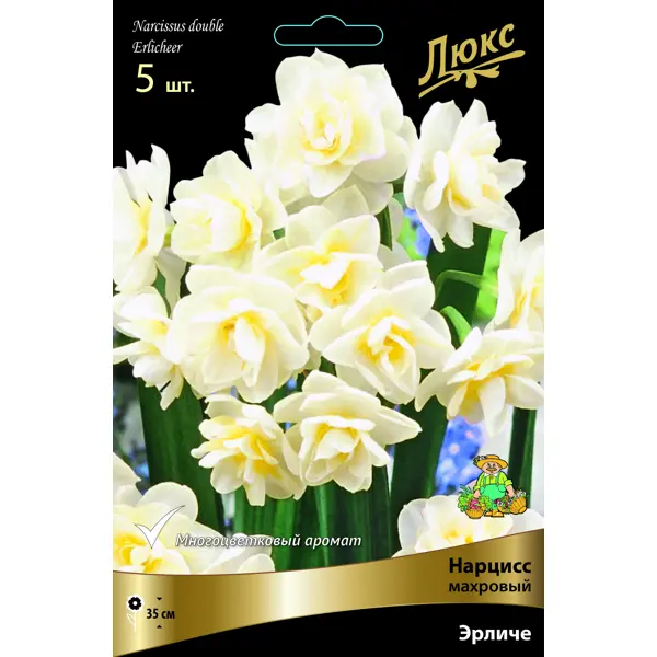 **Нарцисс махровый «Эрличе»** - многолетнее луковичное растение. Очень широко применяется в садовом дизайне благодаря огромному разнообразию видов, гибридов и форм. Цветки крупные, одиночные или в кистях, часто душистые, несколько поникающие, простые или махровые, 2-6 см в диаметре. Сорта группы Махровые нарциссы выделяются махровыми цветками от одного до нескольких на цветоносе. Это самая популярная группа в любительском садоводстве. Махровые сорта отличаются формой цветков, их размерами и окраской. Высота растений от 15 до 45 см. **Месторасположение:** нарциссы - культура более теневыносливая по сравнению, например, с тюльпанами, но на освещенных местах “урожай” их цветков и луковиц значительно выше, чем в тени. **Почва:** мирятся с любой почвой, при условии, что она хорошо дренирована и плодородна. На одном месте могут оставаться 3-5 лет. **Посадка:** высаживать луковицы следует на глубину 15-20 см на расстоянии 10-12 см друг от друга. Лучшее время для посадки луковиц нарциссов а