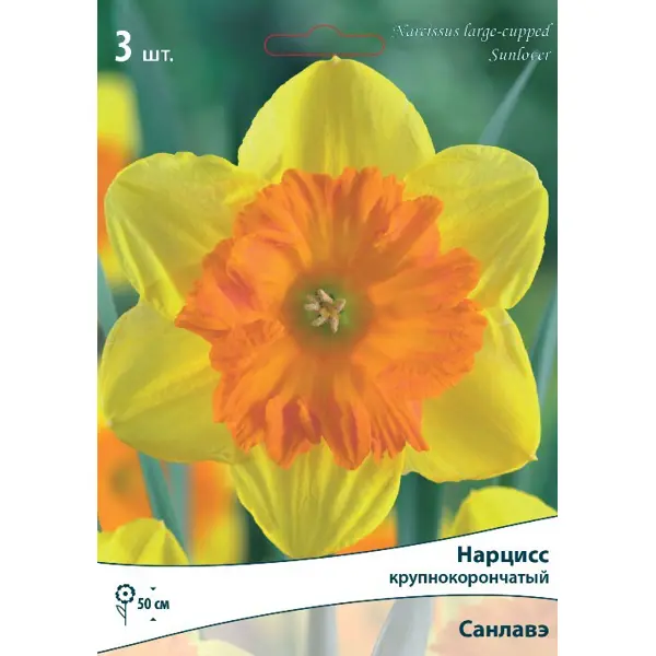 **Нарцисс крупнокорончатый «Санлавэ»** - многолетнее луковичное растение. Широко применяется в садовом дизайне благодаря огромному разнообразию видов, гибридов и форм. Цветки крупные, одиночные или в кистях, часто душистые, несколько поникающие, простые или махровые, 2-6 см в диаметре. Крупнокорончатые нарциссы – группа сортов с одиночными цветками, коронки которых короче долей околоцветника, но не менее 1/3 их длины. Они пользуются особой популярностью в декоративном садоводстве. Крупнокорончатые сорта отличаются большим разнообразием коронок как по форме, размеру, так и по окраске. **Месторасположение:** нарциссы - культура более теневыносливая по сравнению, например, с тюльпанами, но на освещенных местах “урожай” их цветков и луковиц значительно выше, чем в тени. **Почва:** мирятся с любой почвой, при условии, что она хорошо дренирована и плодородна. На одном месте могут оставаться 3-5 лет. **Посадка:** высаживать луковицы следует на глубину 15-20 см на расстоянии 10-12 см друг