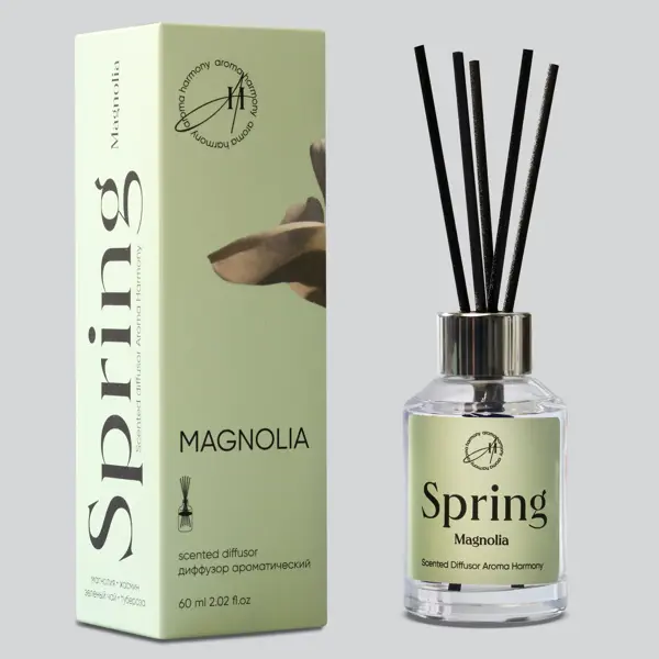**Ароматический диффузор Aroma Harmony Spring Magnolia** — удобное и простое в использовании приспособление, при помощи которого можно создать комфортную атмосферу в доме. Аксессуар источает приятный, легкий аромат, наполняющий атмосферу свежестью и уютом. Способ применения максимально простой — достаточно открыть упаковку, извлечь бутылочку и вставить в нее палочки. Чем больше последних, тем насыщеннее распространяемый аромат и, наоборот. ### Особенности: - объем составляет 60 мл; - основа не содержит этиловый спирт; - количество палочек (входят в комплект) — 7 штук: - легкий, приятный аромат; - можно регулировать интенсивность распространения запаха; - может служить красивым предметом интерьера; - продолжительное действие.