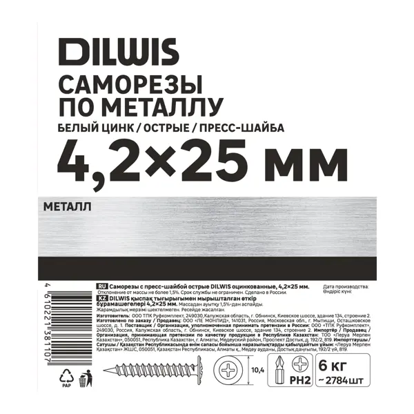 Саморезы по металлу Dilwis с пресс-шайбой острые оцинкованные 4.2x25 мм на вес
