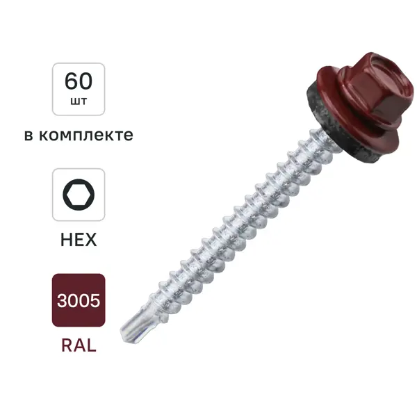 Саморезы кровельные по дереву DILWIS с пресс-шайбой со сверлом RAL 3005 4.8x51 мм 60 шт.