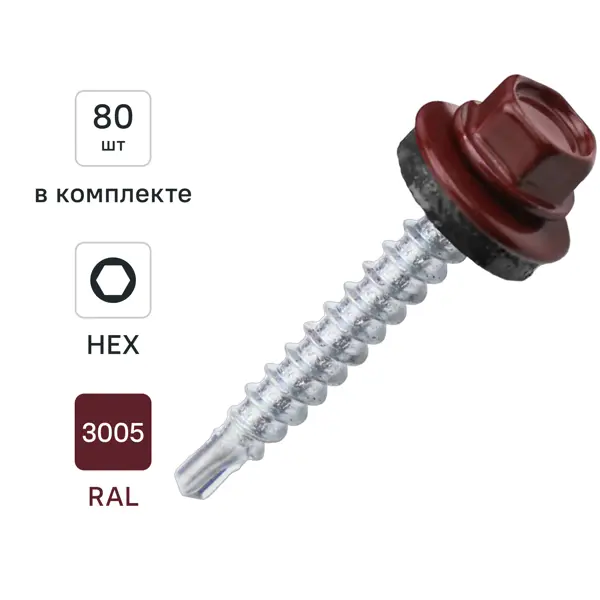 Саморезы кровельные по дереву DILWIS с пресс-шайбой со сверлом RAL 3005 4.8x35 мм 80 шт.