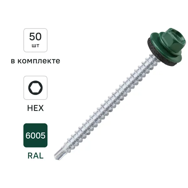 Саморезы кровельные по дереву DILWIS с пресс-шайбой со сверлом RAL 6005 4.8x64 мм 50 шт.