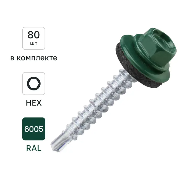 Саморезы кровельные по дереву DILWIS с пресс-шайбой со сверлом RAL 6005 4.8x35 мм 80 шт.