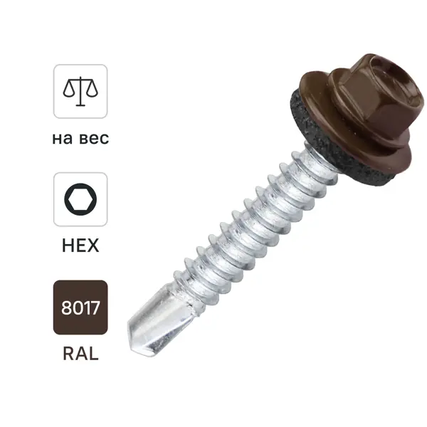 **Саморезы кровельные по металлу с буром RAL 8017 5.5x38 мм на вес** предназначены для надежного крепления кровельных материалов к металлическим поверхностям. Эти саморезы отличаются высокой прочностью и долговечностью, обеспечивая надежную фиксацию элементов кровли даже в условиях сильных ветров и осадков. ### Преимущества - **Высокая прочность и долговечность** - саморезы изготовлены из высококачественной стали, покрытой слоем цинка, что обеспечивает их устойчивость к коррозии и механическим воздействиям. - **Удобство монтажа** - саморезы оснащены сверлом, которое позволяет легко и быстро сделать отверстие в металле, не требуя дополнительных инструментов. - **Шестигранная головка** - обеспечивает надежный захват инструментом, упрощая процесс завинчивания и исключая возможность проскальзывания. - **Шестигранный шлиц** - обеспечивает надежное и плотное соединение с инструментом, исключая возможность повреждения самореза во время монтажа. - **Покрытие по каталогу RAL 8017** - обеспеч