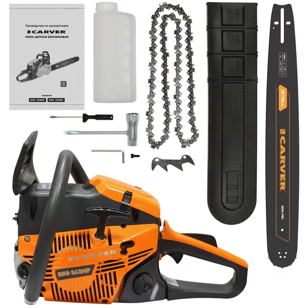 | Аксессуары в комплекте | чехол для шины, ёмкоcть для смешивания топливной смеси, ключ-отвёртка, отвёртка для регулирования карбюратора, ключ шестигранный, упор зубчатый с крепежём, руководство по эксплуатации. |