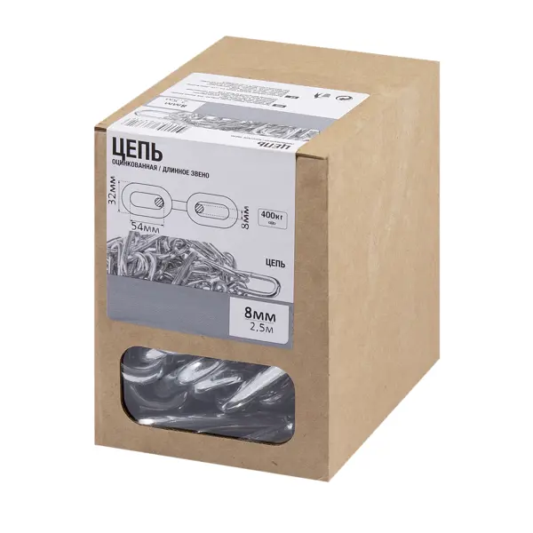 Цепь 8 мм длинное звено 2.5 м сталь оцинкованная