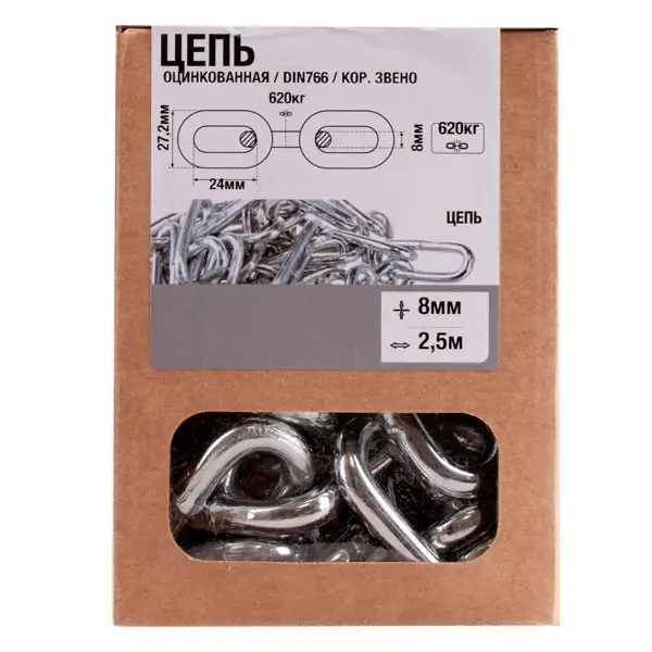 Цепь 8 мм короткое звено 2.5 м сталь оцинкованная