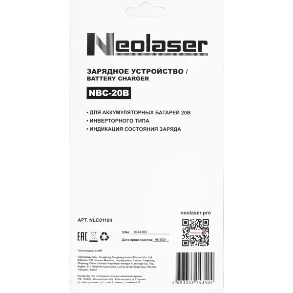 Инверторное **зарядное устройство Neolaser** обеспечивает бережную зарядку аккумуляторов и их максимальный рабочий ресурс. ### Особенности: - Устройство совместимо со всеми аккумуляторами Neolaser вне зависимости от их ёмкости. - Заряжает АКБ особым щадящим методом, что сообщает аккумуляторной сборке наибольшую возможную на текущий момент ёмкость. **БЕРЕЖНО К ЛЮДЯМ, БЕРЕЖНО К ПРИРОДЕ** - Этот товар имеет бесплатную расширенную гарантию от 3 лет. Благодаря увеличенному периоду бесплатного сервисного обслуживания вы продлеваете срок службы товара, экономите на покупке нового в случае поломки и снижаете влияние на окружающую среду.