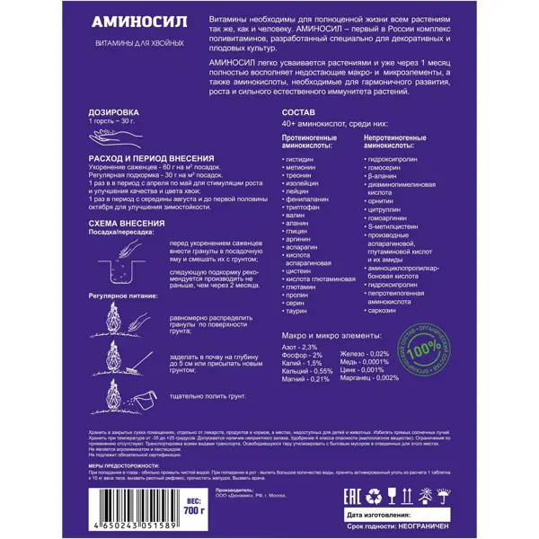 **Удобрение Аминосил для хвойных** — средство с длительным действием, которое поможет вырастить красивые и пышные растения. Это обеспечивается за счет богатого химического состава — в него входят все необходимые для нормального роста и развития хвойных макро- и микроэлементы. Гранулы обеспечивают деревья и кустарники комплексным питанием. Высокое содержание аминокислот способствует улучшению обмена веществ. Кроме того, растения приобретают повышенную устойчивость к негативным внешним фактором и погодным условиям, что позволяет культивировать их в условиях городской среды. Также аминосил позволяет добиться улучшенной декоративности хвойных при минимальном уходе. Перед укоренением саженцев необходимо внести гранулы в посадочную яму и перемешать их с грунтом. Следующую подкормку можно внести не раньше, чем через 2 месяца. При регулярном питании гранулы аминосила равномерно распределяют по поверхности земли и заделывают в грунт на глубину до 5 см, после чего тщательно поливают водой. ###