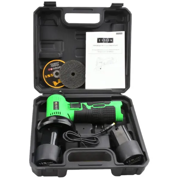 **Углошлифовальная машина аккумуляторная бесщеточная Zitrek ZKAG12 (75мм, 12 B, Li-Ion акк. 2x3.0Ач, кейс) ** универсальный инструмент для резки, шлифования и зачистки изделий из камня, металла и других материалов. Подходит для обработки и зачистки сварочных швов, устранения ржавчины с поверхности и полировки. ### Характеристики: