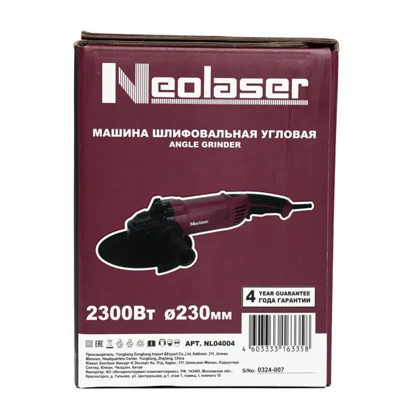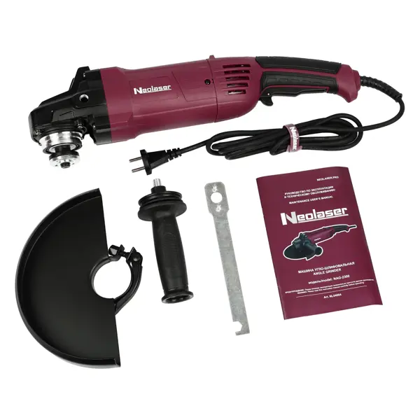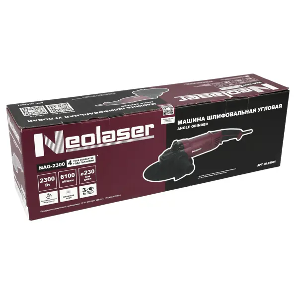**Угловая шлифовальная машина Neolaser NAG-2300** - предназначена для абразивного отрезания и шлифовки различных материалов, а также для работы проволочными щетками. УШМ Neolaser NAG-2300 будет полезна там, где необходимы высокая производительность и глубокий пропил. За счёт своей высокой мощности, большого диаметра пильного диска, а также встроенной продвинутой пылезащиты – данная УШМ прекрасно подходит для тяжёлых задач - резки кирпича, бетона, природного камня, тротуарной плитки и так далее. ### Преимущества: - Гарантия 4 года (при регистрации инструмента на сайте производителя в течение 4-х недель с момента покупки); - Мощность двигателя в 2300 Вт позволяет с комфортом работать с различными материалами и выполнять разнообразные задачи; - Быстросъёмный кожух экономит ваше время для выполнения рабочих задач; - Трёхметровый кабель обеспечивает свободу перемещения и позволяет продуктивно работать с длинными заготовками. **БЕРЕЖНО К ЛЮДЯМ, БЕРЕЖНО К ПРИРОДЕ** - Этот товар имеет беспла