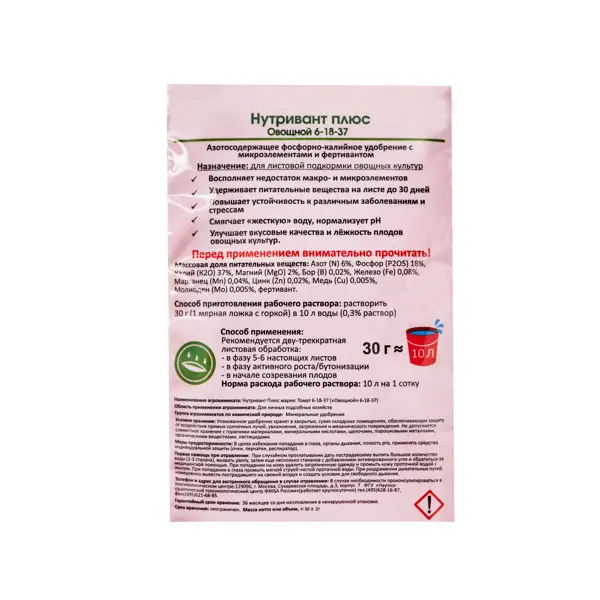 Удобрение Нутривант Плюс Овощной 6-18-37 30 г