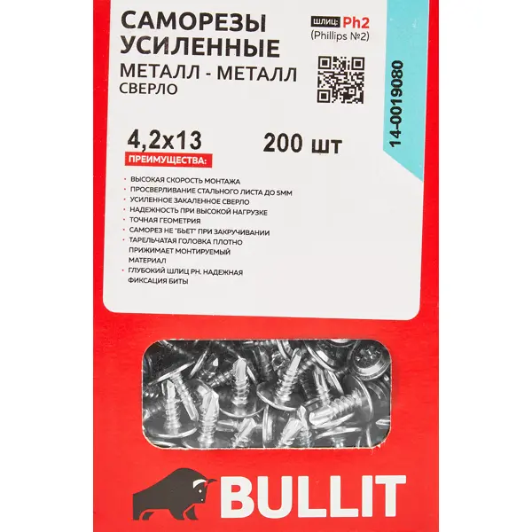 **Саморезы по металлу Bullit (ШСММ-ПШ) с буром** с шлицем Phillips №2 предназначены для быстрого монтажа листов стали к основанию. Просверливают листы толщиной до 5 мм. Размер самореза — 4.2x13 мм. ### Преимущества: - Тарельчатая головка для плотного прижатия материала. - Усиленное закаленное сверло и точная геометрия. - Надежная фиксация биты. Продаются в упаковке по 200 шт.