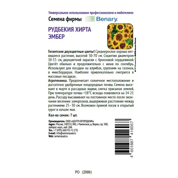 Гигантские двухцветные цветы! Среднерослое хорошо ветвящееся растение, высотой 50-70 см. Соцветия диаметром 10-15 см, двухцветной окраски с бронзовой сердцевиной. Цветёт обильно и продолжительно с июня по сентябрь. Используют для посадки на клумбах, группами на газонах, в миксбордерах. Наиболее привлекательно смотрится в массовых посадках. Агротехника. Предпочитает солнечное местоположение и достаточно удобренные плодородные почвы. Семена высевают в марте в рассадные ящики, слегка присыпая землей. При температуре почвы +18°С всходы появляются на 14-21 день. Рассаду высаживают на постоянное место после окончания весенних заморозков, выдерживая расстояние между растениями 25–30 см. Возможен прямой посев в открытый грунт в начале мая. Семена соответствуют требованиям международных стандартов и ГОСТу 12260-81