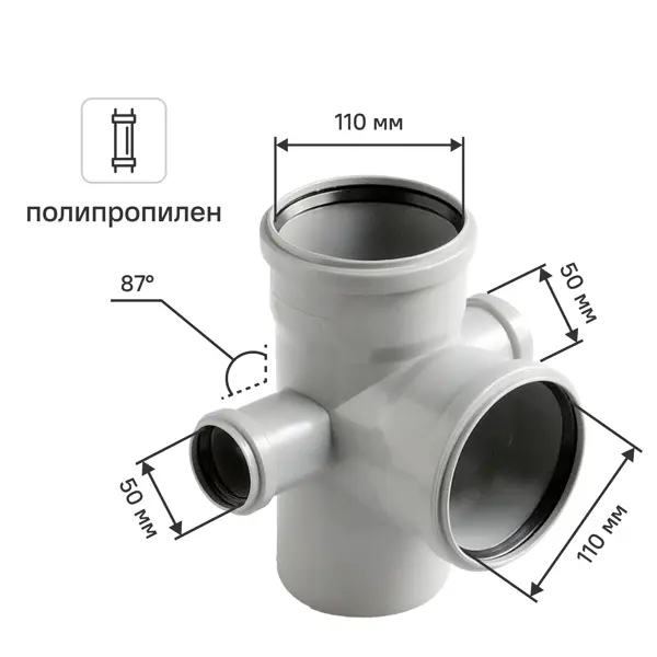 **Крестовина двухплоскостная Политрон 110X50X50X110** специальный соединительный элемент, предназначенный для слива сточных вод сразу из двух плоскостей. Также подходит для отвода сточных или агрессивных вод. Используется для формирования внутренней хозяйственно-бытовой канализационной системы. Крестовина выполнена из полипропилена, за счет чего отличается рядом преимуществ: - легкая конструкция и небольшой вес облегчают установку и транспортировку; - гладкие внутренние стенки исключаются вероятность возникновения застоев и засоров; - устойчивая к постоянному воздействию влаги; - не подвержена влиянию коррозии. Угол двухплоскостной крестовины составляет 87 °. Изделие произведено в России. На товар распространяется гарантия 10 лет.