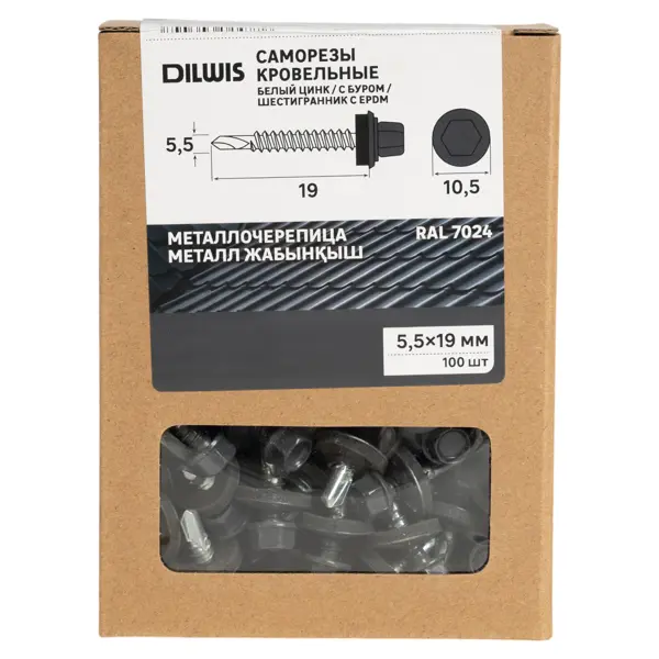 **Саморезы по металлу Dilwis с пресс-шайбой со сверлом оцинкованные 5.5x19 мм RAL 7024 100 шт.** предназначены для применения в различных областях, включая строительство и производство. Они имеют оцинкованное покрытие, что обеспечивает повышенную коррозионную стойкость и долговечность. Основным материалом этих саморезов является сталь, что гарантирует их высокую прочность и надежность. Материал поверхности применения этих саморезов - любые материалы, что делает их универсальными. Они имеют наконечник-сверло, что позволяет использовать их для сверления и закрепления различных материалов. ### Преимущества - Высокая коррозионная стойкость за счет оцинкованного покрытия - Универсальность применения - Высокая прочность и надежность - Наконечник-сверло для легкого сверления и закрепления материалов - Пресс-шайба для надежного закрепления - Шестигранный шлиц для удобного использования с ключом или отверткой