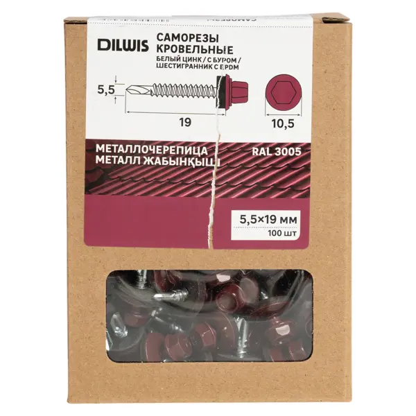 **Саморезы по металлу Dilwis с пресс-шайбой со сверлом оцинкованные RAL 3005 5.5x19 мм 100 шт.** используются для крепления различных металлических конструкций и деталей. Они имеют оцинкованное покрытие, что обеспечивает высокую коррозионную стойкость и долговечность. Саморезы изготовлены из стали и имеют шестигранный шлиц, что позволяет легко и надежно закреплять их в металле. Кроме того, они имеют сверло на наконечнике, что упрощает процесс сверления и закрепления. Цвет по каталогу RAL - RAL 3005, а размер шлица - HEX1.5. ### Преимущества - Высокая коррозионная стойкость благодаря оцинкованному покрытию - Удобный шестигранный шлиц для легкого закрепления - Наконечник-сверло для упрощения процесса сверления и закрепления - Изготовлены из прочной стали для долговечности и надежности - Пресс-шайба для дополнительной фиксации и предотвращения ослабления соединения