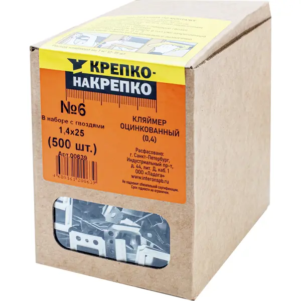 **Кляймеры оцинкованные № 6** предназначены для скрытого монтажа вагонки, панелей из МДФ, пластика и других видов отделочных материалов на подготовленные поверхности. Крепление производится при помощи гвоздей. Оцинкованная сталь не подвержена коррозии и прослужит долгие годы. В комплект входит 500 кляймеров с гвоздями 1,4 х 25 мм. ### Особенности: - незаметны после установки; - не повреждают обшивку; - оставляют возможность вагонке продольно двигаться во избежание деформации; - страна производства — Россия.