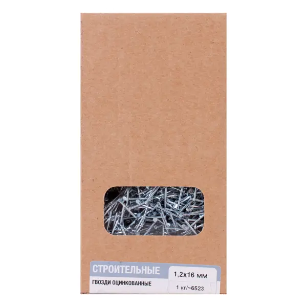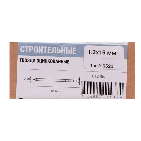 **Гвозди строительные** — широко распространенный вид метизов, который нашел широкое применение не только в профессиональной сфере, но и в быту. Этот тип крепежа представляет собой гладкий металлический стержень, который имеет острый конец и плоскую шляпку (головку). Материалом для изготовления гвоздя служит сталь. Предусмотрено оцинкованное покрытие, которое защищает основу от коррозии. ### Особенности: - размеры — 1,2 х 16 мм; - тип покрытия — оцинкованное; - общий вес составляет 1 кг; - широкая область применения; - отличная прочность и износостойкость; - простота монтажа и демонтажа.