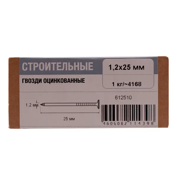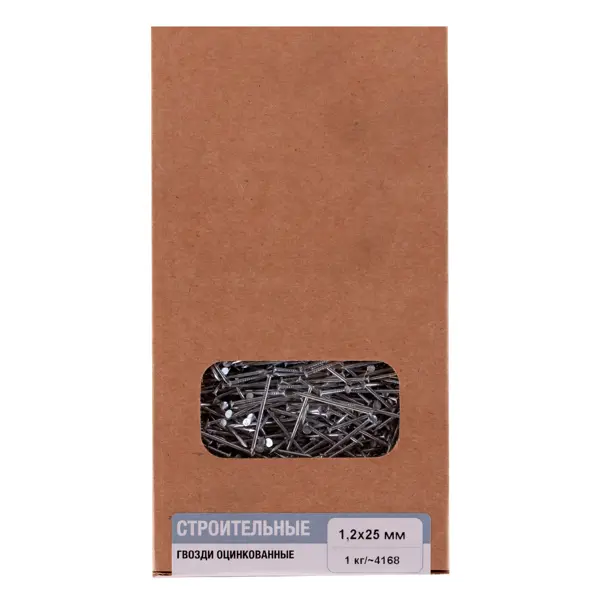 **Гвозди строительные** — широко распространенный вид метизов, который нашел широкое применение не только в профессиональной сфере, но и в быту. Этот тип крепежа представляет собой гладкий металлический стержень, который имеет острый конец и плоскую шляпку (головку). Материалом для изготовления гвоздя служит сталь. Предусмотрено оцинкованное покрытие, которое защищает основу от коррозии. ### Особенности: - размеры — 1,2 х 25 мм; - тип покрытия — оцинкованное; - общий вес составляет 1 кг; - широкая область применения; - отличная прочность и износостойкость; - простота монтажа и демонтажа.