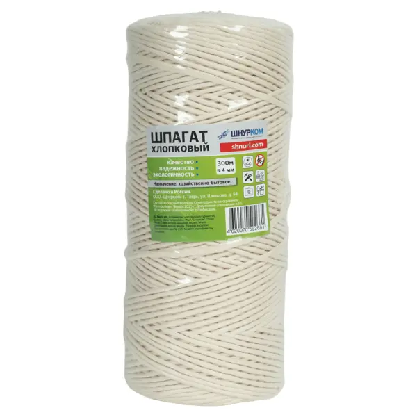 **Шпагат натуральный хлопчатобумажный** используют при изготовлении свеч, в рукоделии, для декорирования интерьеров, для шнурования мясных изделий. Применяют шпагат во время садово-огородных работ, в хозяйственно-бытовой сфере, а еще им упаковывают подарки. ### Преимущества: - Диаметры от 1мм до 4мм. - Производится по средствам скручивания нескольких прядей в единое изделие. - Шпагаты по 100 метров 1мм и 2мм смотаны в клубок, остальные наматываются на втулку. - Натуральный шнур полностью экологически чистый, не выделяет вредные вещества в атмосферу даже при воздействии высоких температур или при горении. - Не накапливает в себе статическое электричество, хорошо впитывает влагу