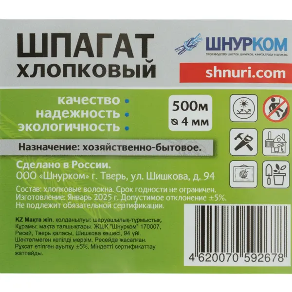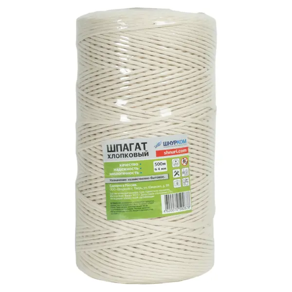 **Шпагат натуральный хлопчатобумажный** используют при изготовлении свеч, в рукоделии, для декорирования интерьеров, для шнурования мясных изделий. Применяют шпагат во время садово-огородных работ, в хозяйственно-бытовой сфере, а еще им упаковывают подарки. ### Преимущества: - Диаметры от 1мм до 4мм. - Производится по средствам скручивания нескольких прядей в единое изделие. - Шпагаты по 100 метров 1мм и 2мм смотаны в клубок, остальные наматываются на втулку. - Натуральный шнур полностью экологически чистый, не выделяет вредные вещества в атмосферу даже при воздействии высоких температур или при горении. - Не накапливает в себе статическое электричество, хорошо впитывает влагу