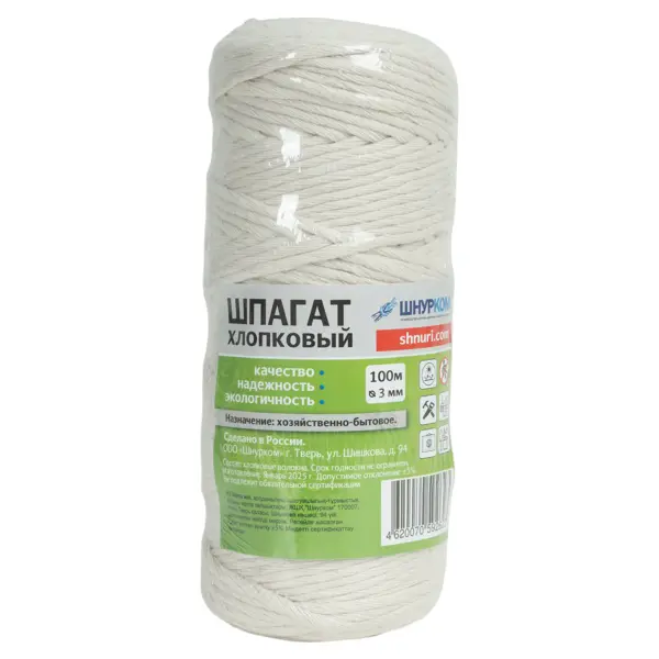 **Шпагат натуральный хлопчатобумажный** используют при изготовлении свеч, в рукоделии, для декорирования интерьеров, для шнурования мясных изделий. Применяют шпагат во время садово-огородных работ, в хозяйственно-бытовой сфере, а еще им упаковывают подарки. ### Преимущества: - Диаметры от 1мм до 4мм. - Производится по средствам скручивания нескольких прядей в единое изделие. - Шпагаты по 100 метров 1мм и 2мм смотаны в клубок, остальные наматываются на втулку. - Натуральный шнур полностью экологически чистый, не выделяет вредные вещества в атмосферу даже при воздействии высоких температур или при горении. - Не накапливает в себе статическое электричество, хорошо впитывает влагу