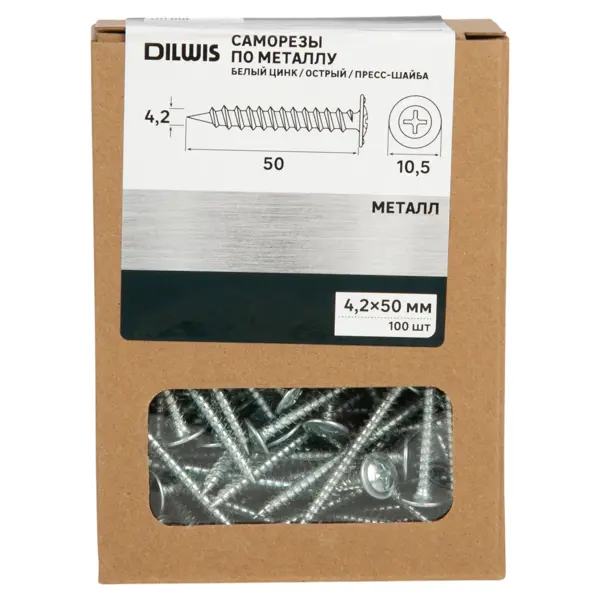 **Саморезы по металлу Dilwis потайные острые оцинкованные 4.2x50 мм 100 шт.** используются для крепления различных металлических конструкций и деталей. Они имеют острый наконечник, который позволяет легко и быстро завинчивать их в металл без предварительного сверления. Саморезы изготовлены из углеродистой стали и имеют оцинкованное покрытие, что обеспечивает их высокую коррозионную стойкость. Они имеют шлиц Phillips (PH) и предназначены для использования в металлических поверхностях. ### Преимущества - Высокая коррозионная стойкость благодаря оцинкованному покрытию - Острый наконечник для легкого завинчивания в металл - Прочная конструкция из углеродистой стали - Удобный шлиц Phillips (PH) для легкого использования - Подходят для различных металлических поверхностей