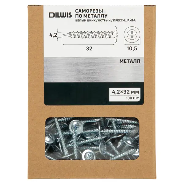 **Саморезы по металлу Dilwis потайные острые оцинкованные 4.2x32 мм 180 шт.** используются для соединения металлических конструкций и деталей. Они имеют острый наконечник, который позволяет легко и быстро завинчивать их в металл без предварительного сверления. Саморезы изготовлены из углеродистой стали и имеют оцинкованное покрытие, которое обеспечивает их коррозионную стойкость. Они имеют шлиц Phillips (PH) и предназначены для использования в металлических поверхностях. ### Преимущества - Высокая коррозионная стойкость благодаря оцинкованному покрытию - Острый наконечник позволяет легко завинчивать саморезы в металл - Прочная конструкция из углеродистой стали - Удобный шлиц Phillips (PH) для легкого завинчивания - Подходят для использования в различных металлических конструкциях