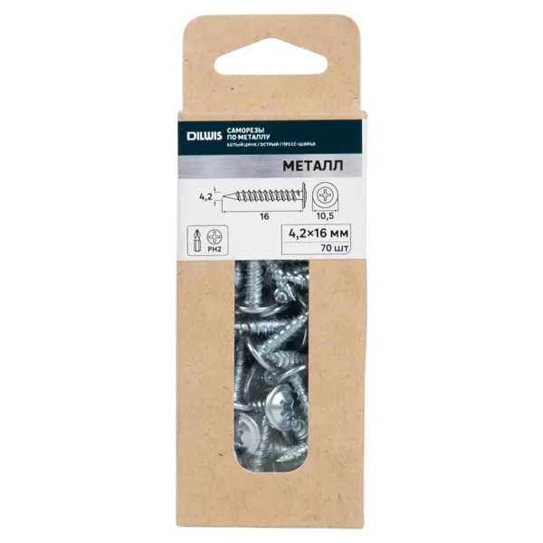 **Саморезы по металлу Dilwis потайные острые оцинкованные 4.2x16 мм 70 шт.** используются для крепления различных металлических конструкций и деталей. Они имеют острый наконечник, который позволяет легко и быстро закрепить их в металле без предварительного сверления. Саморезы изготовлены из углеродистой стали и имеют оцинкованное покрытие, которое защищает их от коррозии. Они имеют шлиц Phillips (PH) и подходят для использования в различных металлоизделиях. ### Преимущества - Высокая прочность и надежность - Легкость закрепления в металле - Защита от коррозии благодаря оцинкованному покрытию - Универсальность использования в различных металлических конструкциях - Экономичность и доступность при покупке в упаковке по 70 штук