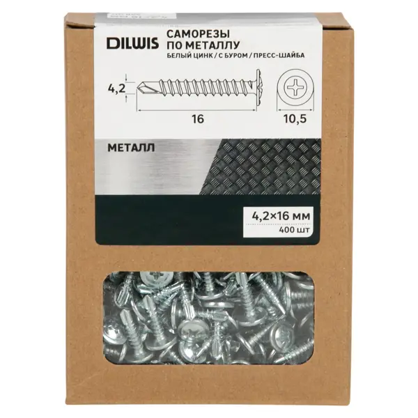 **Саморезы по металлу Dilwis потайные со сверлом оцинкованные 4.2x16 мм 400 шт.** используются для крепления различных металлических конструкций и деталей. Они предназначены для работы с металлом и имеют оцинкованное покрытие, которое обеспечивает защиту от коррозии. Саморезы имеют диаметр 4.2 мм и длину 16 мм, что позволяет им надежно закреплять детали без повреждения материала. Шлиц Phillips (PH) обеспечивает легкое и надежное завинчивание. ### Преимущества - Высокая прочность и надежность - Защита от коррозии благодаря оцинкованному покрытию - Легкое завинчивание благодаря шлицу Phillips (PH) - Подходят для работы с различными металлическими конструкциями и деталями - Имеют бур, который позволяет легко сверлить отверстия в металле