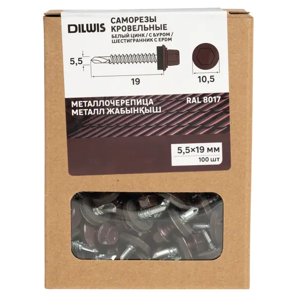 **Саморезы по металлу Dilwis с пресс-шайбой со сверлом оцинкованные 5.5x19 мм RAL 8017 100 шт.** используются для крепления различных металлических конструкций и изделий. Они имеют оцинкованное покрытие, которое обеспечивает высокую коррозионную стойкость и долговечность. Эти саморезы подходят для применения с любыми материалами и оснащены наконечником-сверлом, что упрощает процесс крепления. Шлиц у этих саморезов шестигранный, а диаметр составляет 5,5 мм, длина - 19 мм. ### Преимущества - Высокая коррозионная стойкость благодаря оцинкованному покрытию - Универсальность применения с различными материалами - Наконечник-сверло для легкого и быстрого крепления - Шестигранный шлиц для надежного и удобного использования - Пресс-шайба для дополнительной фиксации и безопасности соединения