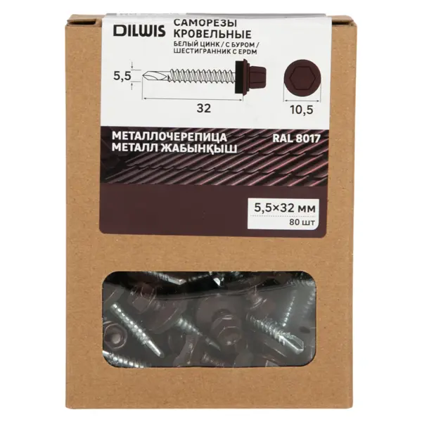 **Саморезы по металлу Dilwis с пресс-шайбой со сверлом оцинкованные 5.5x32 мм RAL 8017 80 шт.** представляют собой высококачественные крепежные элементы, предназначенные для применения в различных сферах, включая строительство, мебельную промышленность и другие области, где требуется надежное и быстрое крепление к металлическим поверхностям. Эти саморезы изготовлены из стали с оцинкованным покрытием, что обеспечивает их высокую коррозионную стойкость и долговечность. Они оснащены пресс-шайбой и сверлом, что позволяет использовать их для крепления различных материалов, включая металл, дерево и пластик. Кроме того, наличие шестигранного шлица (HEX2) и сверла в наконечнике упрощает процесс вкручивания и повышает эффективность монтажа. ### Преимущества - Высокая коррозионная стойкость за счет оцинкованного покрытия - Универсальность применения благодаря наличию сверла и пресс-шайбы - Быстрое и надежное крепление к металлическим поверхностям - Прочность и долговечность конструкции за счет
