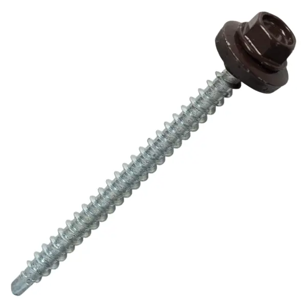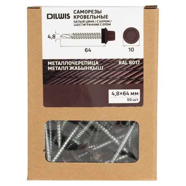 **Саморезы кровельные по дереву Dilwis с пресс-шайбой со сверлом оцинкованные RAL 8017 4.8x64 мм 50 шт.** используются для крепления кровельных материалов к деревянным поверхностям. Они имеют оцинкованное покрытие, которое обеспечивает защиту от коррозии, и шестигранный шлиц, который позволяет легко закручивать их в дерево. Основным материалом этих саморезов является углеродистая сталь, что делает их прочными и надежными. Кроме того, они имеют сверло на наконечнике, которое позволяет легко сверлить отверстия в дереве. Эти саморезы имеют цвет по каталогу RAL 8017 и продаются упаковками по 50 штук. ### Преимущества - Высокая прочность и надежность - Защита от коррозии - Легкость закручивания - Возможность сверления отверстий в дереве - Прочная связь с деревянными поверхностями