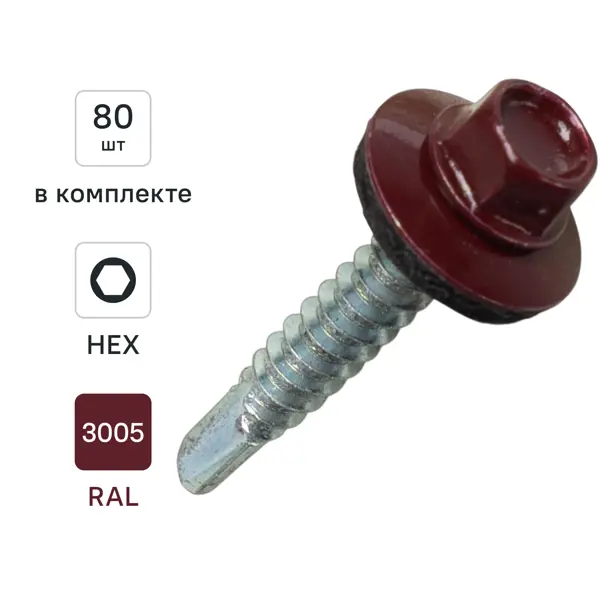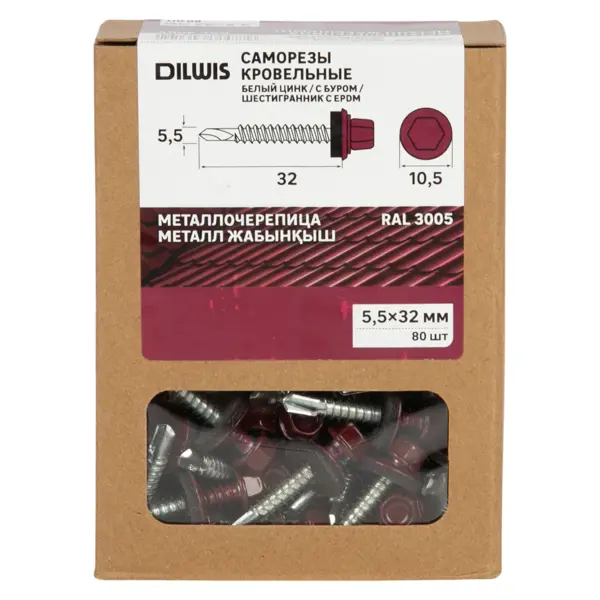 **Саморезы по металлу Dilwis с пресс-шайбой со сверлом оцинкованные 5.5x32 мм RAL 3005 80 шт.** используются для крепления различных металлических конструкций и изделий. Они имеют оцинкованное покрытие, которое обеспечивает защиту от коррозии и увеличивает срок службы. Саморезы изготовлены из стали и имеют шестигранный шлиц, что облегчает их использование. Они также имеют бур, который позволяет легко сверлить отверстия в металле. ### Преимущества - Высокая прочность и надежность - Защита от коррозии - Легкость использования - Универсальность применения - Шестигранный шлиц обеспечивает надежное и плотное закрепление.