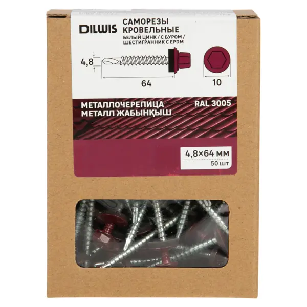 **Саморезы кровельные по дереву Dilwis с пресс-шайбой со сверлом оцинкованные RAL 3005 4.8x64 мм 50 шт.** используются для крепления кровельных материалов к деревянным поверхностям. Они имеют оцинкованное покрытие, которое обеспечивает защиту от коррозии, и шестигранный шлиц, который позволяет легко закручивать их с помощью соответствующего инструмента. Основным материалом, из которого изготовлены эти саморезы, является углеродистая сталь, что обеспечивает их высокую прочность и надежность. Цвет по каталогу RAL - RAL 3005, что придает им эстетически привлекательный вид. ### Преимущества - Высокая прочность и надежность благодаря основному материалу - углеродистой стали - Защита от коррозии благодаря оцинкованному покрытию - Легкость закручивания благодаря шестигранному шлицу - Эстетически привлекательный вид благодаря цвету по каталогу RAL 3005 - Универсальность применения на деревянных поверхностях