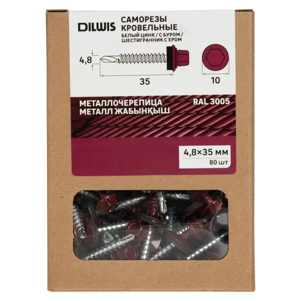 **Саморезы кровельные по дереву Dilwis с пресс-шайбой со сверлом оцинкованные RAL 3005 4.8x35 мм 80 шт.** применяются для крепления кровельных материалов к деревянным поверхностям. Они изготовлены из углеродистой стали и имеют оцинкованное покрытие, что обеспечивает их коррозионную стойкость. Эти саморезы имеют шестигранный шлиц и наконечник в виде сверла, что позволяет легко и быстро закреплять кровельные материалы. Цвет саморезов соответствует каталогу RAL 3005. ### Преимущества - Высокая коррозионная стойкость благодаря оцинкованному покрытию - Легкость и скорость закрепления благодаря наконечнику в виде сверла - Универсальность применения для различных кровельных материалов - Надежное крепление к деревянным поверхностям - Прочность и долговечность конструкции благодаря качественному материалу