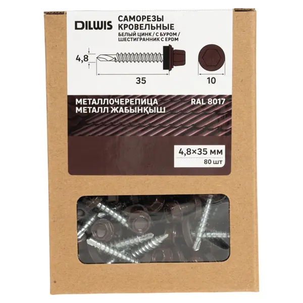 **Саморезы кровельные по дереву Dilwis с пресс-шайбой со сверлом оцинкованные RAL 8017 4.8x35 мм 80 шт.** применяются для крепления кровельных материалов к деревянным поверхностям. Они имеют оцинкованное покрытие, которое обеспечивает защиту от коррозии и увеличивает срок службы. Саморезы изготовлены из углеродистой стали, что придает им высокую прочность и надежность. Наконечник в виде сверла позволяет легко и быстро вкручивать саморезы в дерево. Шестигранный шлиц обеспечивает надежное и удобное закручивание. Цвет по каталогу RAL 8017 придает саморезам эстетически привлекательный вид. ### Преимущества - Высокая прочность и надежность - Защита от коррозии - Легкость и скорость вкручивания - Эстетически привлекательный вид - Универсальность применения - Прочная связь с поверхностью дерева
