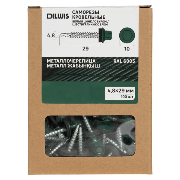 **Саморезы кровельные по дереву Dilwis сс пресс-шайбой о сверлом оцинкованные RAL 6005 4.8x29 мм 100 шт.** используются для крепления кровельных материалов к деревянным поверхностям. Они имеют оцинкованное покрытие, которое обеспечивает защиту от коррозии и продлевает срок службы. Саморезы изготовлены из углеродистой стали, что обеспечивает их высокую прочность и надежность. Они имеют шестигранный шлиц, который позволяет легко и надежно закреплять их с помощью соответствующего инструмента. ### Преимущества - Высокая прочность и надежность благодаря использованию углеродистой стали - Защита от коррозии благодаря оцинкованному покрытию - Легкость и надежность закрепления благодаря шестигранному шлицу - Универсальность применения для крепления различных кровельных материалов к деревянным поверхностям - Определенный цвет по каталогу RAL, что упрощает выбор и обеспечивает единый вид конструкции