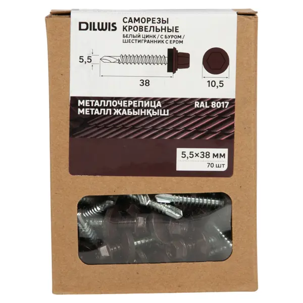 **Саморезы по металлу Dilwis с пресс-шайбой со сверлом оцинкованные RAL 8017 5.5x38 мм 70 шт.** используются для крепления различных металлических конструкций, включая кровельные и стеновые материалы. Они имеют оцинкованное покрытие, которое обеспечивает защиту от коррозии и продлевает срок службы изделия. Саморезы по металлу Dilwis с пресс-шайбой со сверлом оцинкованные RAL 8017 5.5x38 мм 70 шт. оснащены шестигранным шлицом, что упрощает процесс завинчивания. Основным материалом для изготовления этих саморезов является сталь, что обеспечивает высокую прочность и надежность. ### Преимущества - Высокая коррозионная стойкость благодаря оцинкованному покрытию - Универсальность применения на различных материалах - Наличие сверла на наконечнике для облегчения процесса завинчивания - Прочность и надежность конструкции благодаря основному материалу - стали - Удобство завинчивания благодаря шестигранному шлицу - Эффективное крепление металлических конструкций с помощью пресс-шайбы