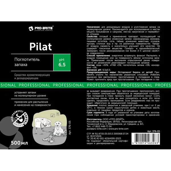 **Поглотитель запаха Pilat** предназначен для дезодорации воздуха и уничтожения запаха на молекулярном уровне. Рекомендуется для использования В местах общего пользования и санузлах, местах накопления и переработки отходов. **Особенности** - готовый к применению препарат, поглощающий на молекулярном уровне зловонные запахи: сероводорода и аммиака, пищевых остатков, пота, табака, домашних животных, отходов, мусора, сточных вод и пр. на различных поверхностях - придаёт воздуху свежесть и значительно улучшает его качество - не содержит токсичные вещества - пожаро- и взрывобезопасный - замерзает, после размораживания (не более 3-5 циклов) свойства сохраняются **Применение** Энергично встряхнуть флакон. Распылить в воздухе помещения или на поверхность вблизи источника запаха. После высыхания опрысканной ранее поверхности её увлажнение реактивирует поглощение запахов.