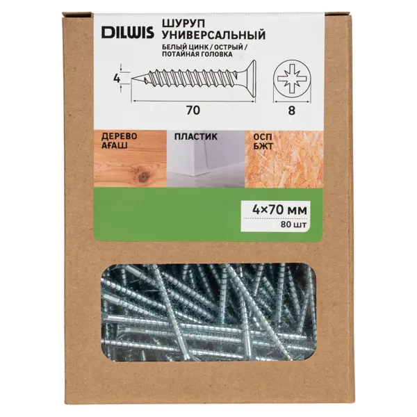 Саморезы универсальные DILWIS потайные острые оцинкованные 4x70 мм 80 шт.