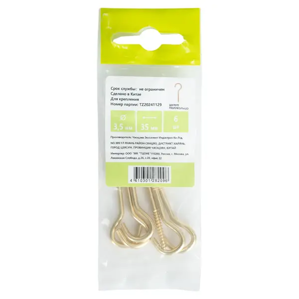 **Винт с крюком** используется для создания негрузоподъемных такелажных систем с применением веревок, тросов, цепей, а также для поддержки проводов. Он выполнен из углеродистой стали. Устанавливается в дерево, бетонные, кирпичные и каменные основания с помощью дюбелей. ### Особенности: - размеры: 3,5 x 35 мм; - цвет: золотой; - в товарной упаковке находится 6 шт.