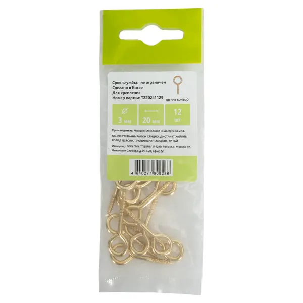 **Шуруп-кольцо** используется для организации легких такелажных устройств негрузоподъемного назначения. Он применяется при монтаже несъемных подвесных конструкций, например, фонарей, кабелей. Шуруп отлично подходит для работы с древесиной, но вкручивается только после предварительно просверленного отверстия. Для установки в бетонные конструкции целесообразно использовать распорные дюбели. ### Особенности: - изделие изготовлено из стальной проволоки и защищено от коррозии цинковым покрытием; - цвет: золотой; - размеры: 3 x 20 мм.