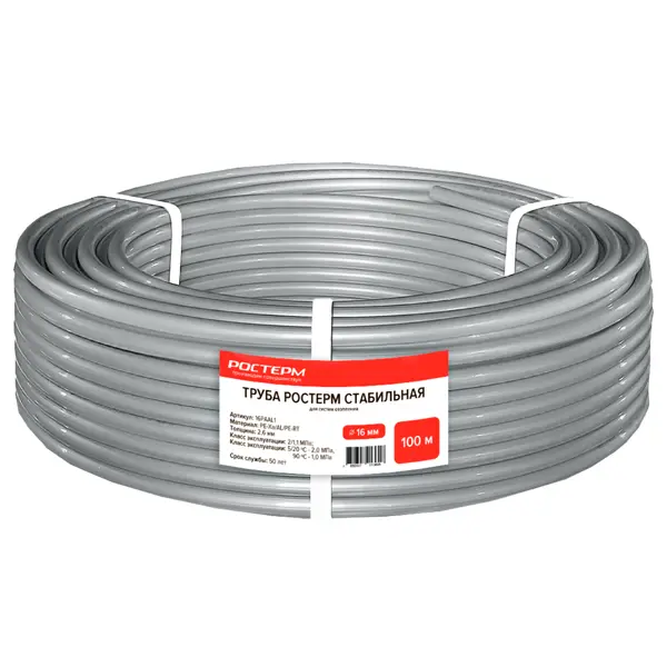 **Труба из сшитого полиэтилена Ростерм Стабильная** диаметром 16 мм и толщиной стенки 2,6 мм изготовлена из сшитого полиэтилена PE-Xa, армированного алюминиевым слоем. Труба РОСТерм Стабильная — это универсальная труба, которая подходит как для высокотемпературного отопления, так и для системы водоснабжения. Температура эксплуатации труб составляет от +5 до +95 °C (при транспортируемой жидкости- воде). **Преимущества:** - Алюминиевый слой обеспечивает защиту от проникновения кислорода в теплоноситель. - Наличие алюминиевого слоя в трубе позволяет фиксировать трубы без использования соединяющих приспособлений. - Устойчивость к химическому воздействию растворителей и масел, трубы не подвержены зарастанию, коррозии и старению. - Не выделяют токсичные вещества, не меняют вкусовые качества воды, цвет, запах, не вредят здоровью. - Изготавливаются только из первичного высококачественного сырья на европейском оборудовании в соответствии со всеми требованиями норм ГОСТов. - Максимальная гарант
