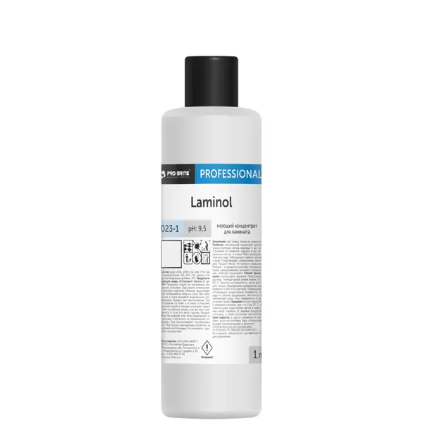 **Моющий концентрат для пола Laminol** предназначен для мойки полов из ламината. **Особенности** - низкопенный концентрат против улично-бытовых, лёгких жировых и др. загрязнений на ламинате, паркете и др. деревянных полах, а также ПВХ-линолеуме - смягчает воду - нейтрализует избыток железа в воде - предотвращает размножение бактерий - придаёт блеск - не требует смывания - пожаро- и взрывобезопасный - замерзает, после размораживания возможно помутнение, свойства сохраняются **Применение** использовать вручную. Приготовить раствор. Температурный режим мойки 20-60° С. Нанести на поверхность, затем вытереть насухо. Максимальное разбавление для ламината 1/200 (0,5%-раствор). Оптимальную концентрацию определять по виду и степени загрязнения, жёсткости и температуре воды, типу поверхности и др. условиям мойки. **Состав:** вода; ПАВ; поликарбоксилат; ИПС; щёлочь; ароматизатор.